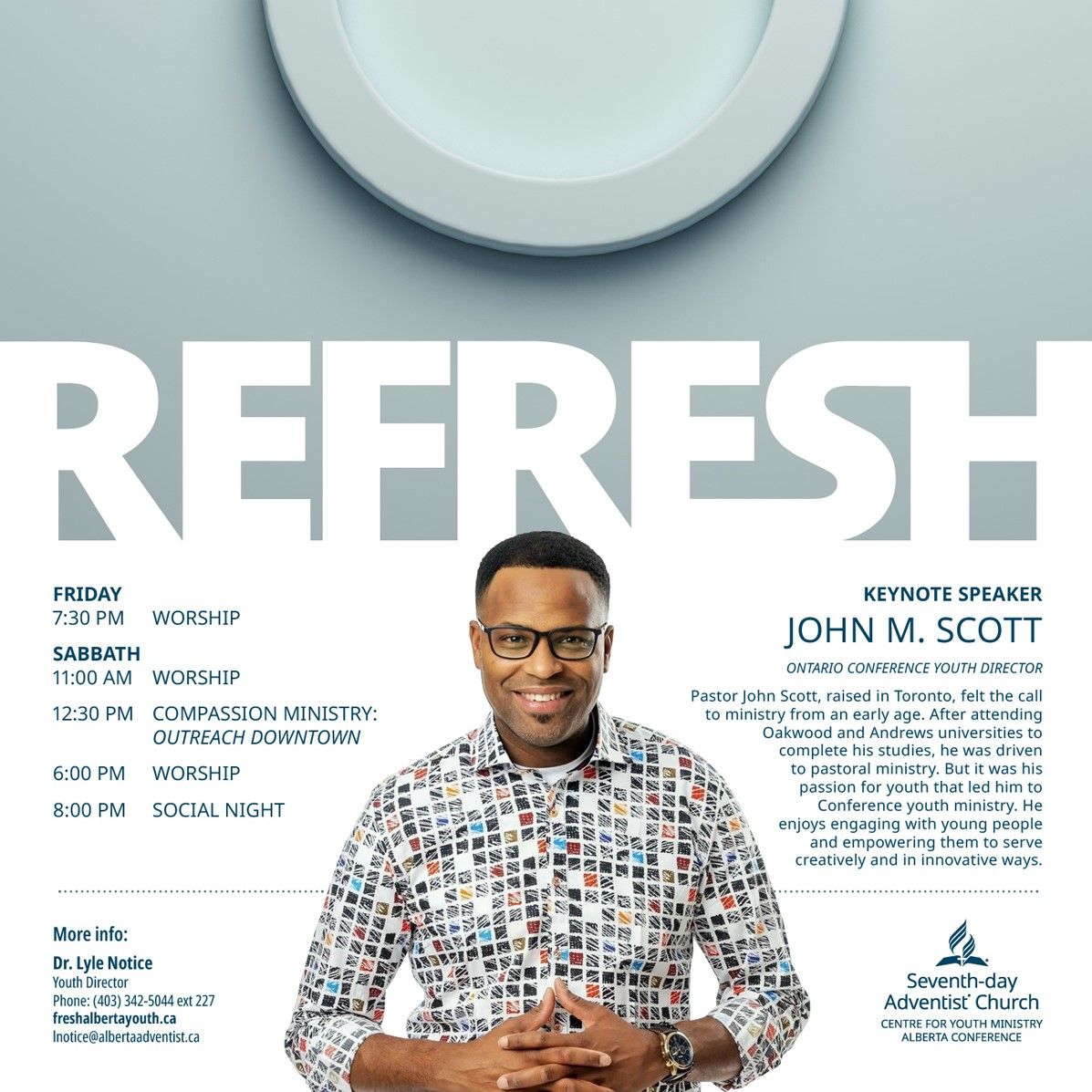ADMISSION IS FREE!!! INTENT: To create an awareness of and passion for Adventist Christian Fellowship Ministry in Canada. KEYNOTE SPEAKER: Pastor Moises Ruiz (Epic Adventist Church, Red Deer, AB) PRESENTERS: Pastor Romando Carey, Wendy Eberhardt, Nina Lim, Pastor Campbell Page, Pastor Ngoy Kyala, Pastor Joshua Nelson, Pastor Ron Pickell, Natasha Richards, Pastor Daniel Saugh, Jonathan Wheeler