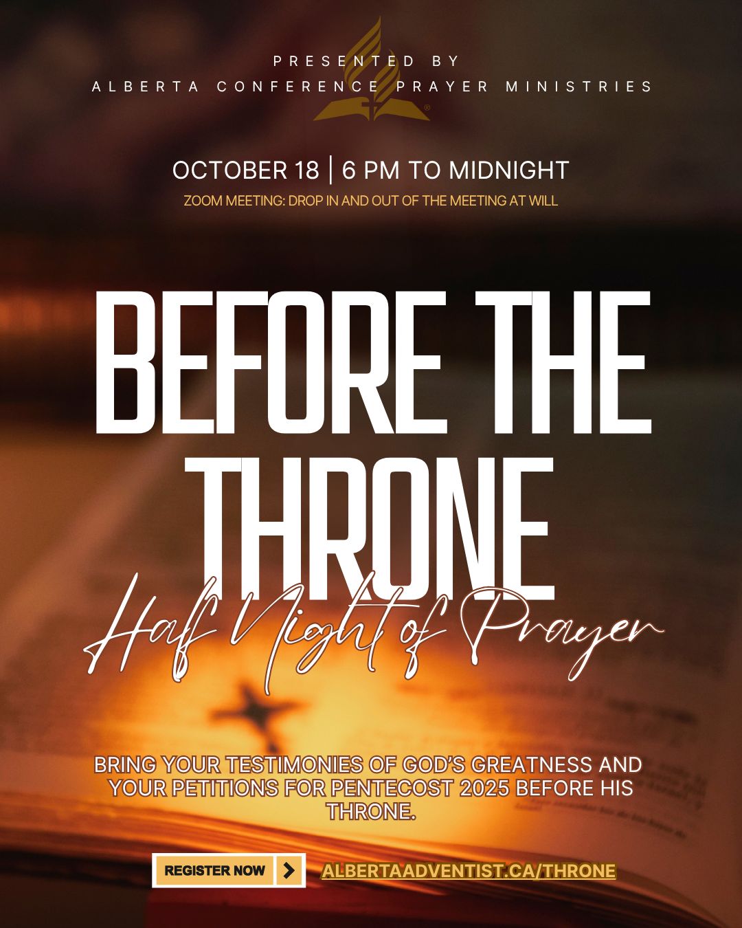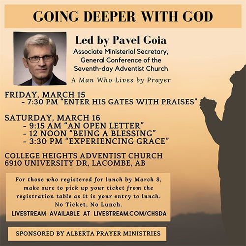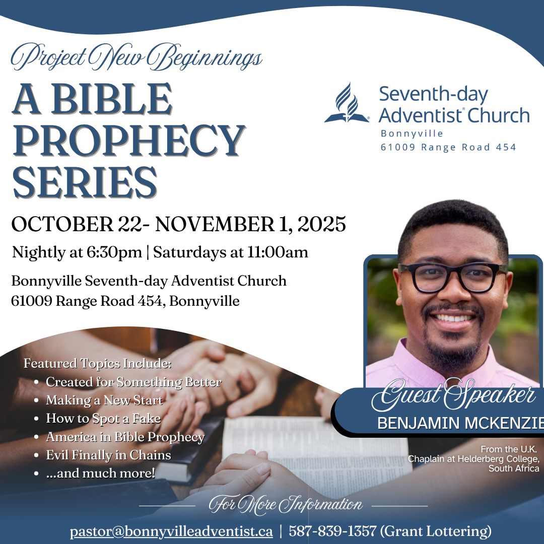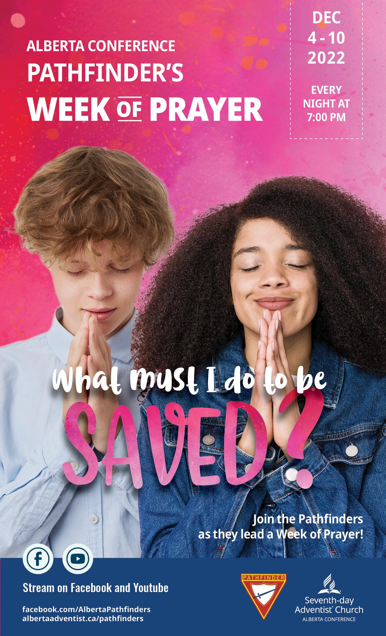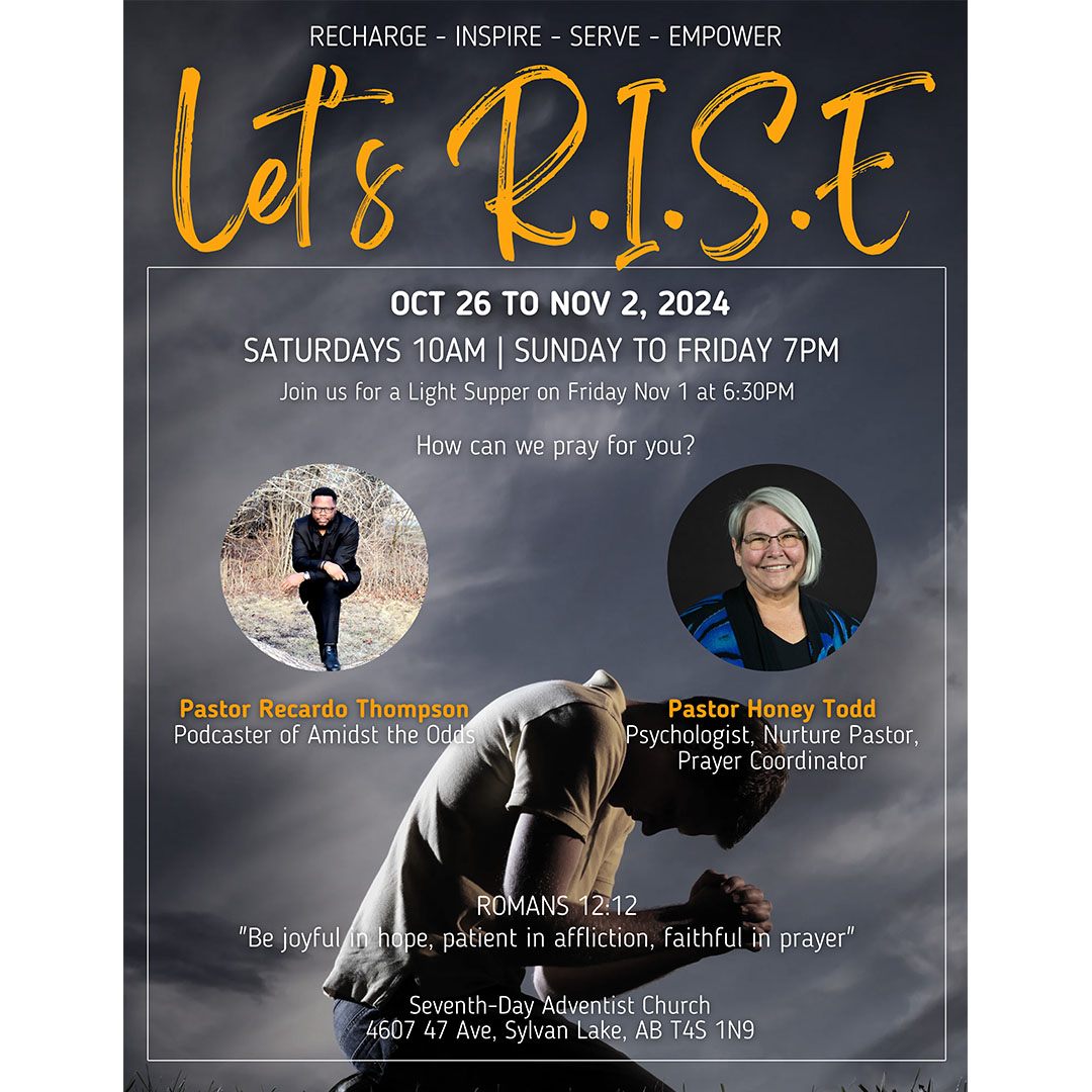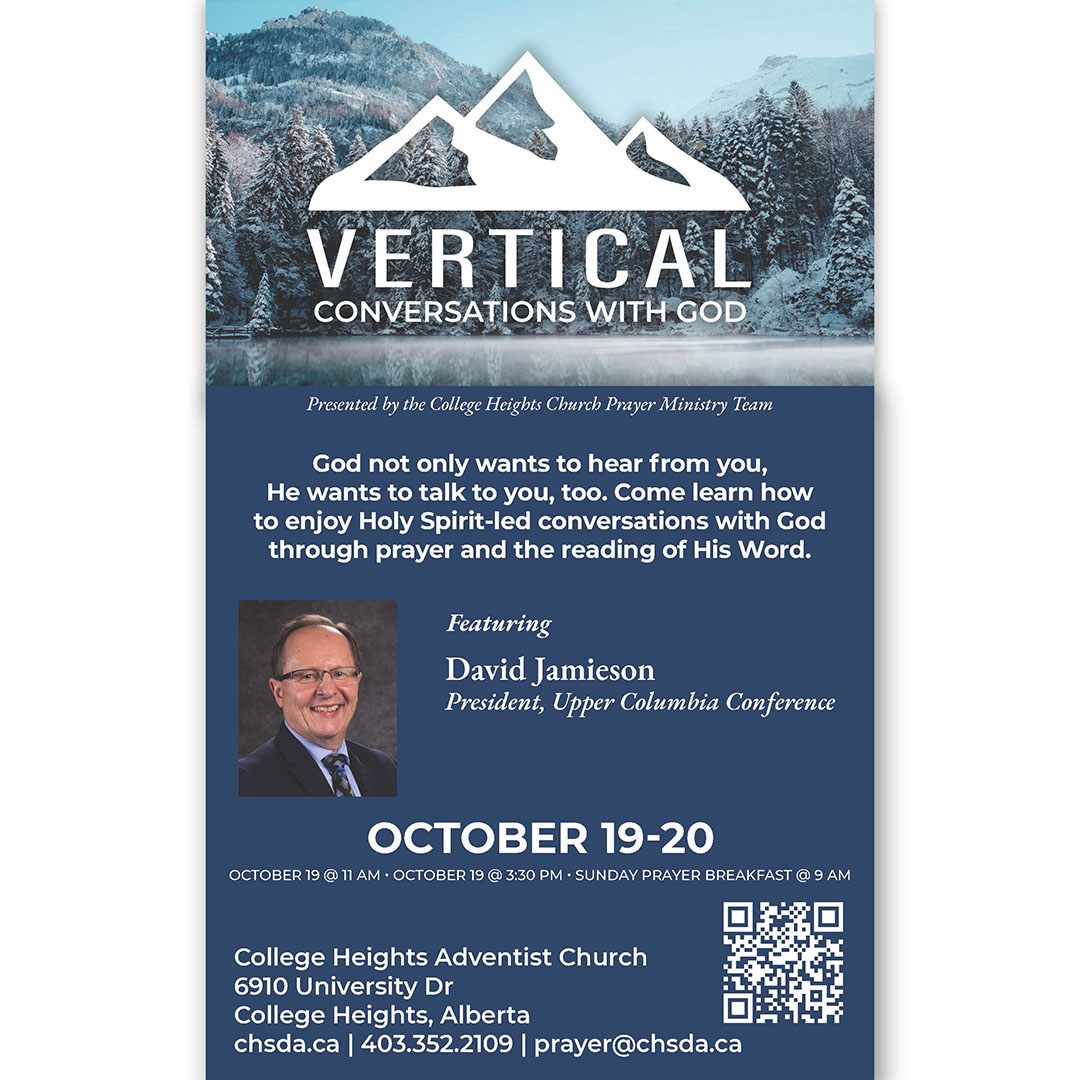 Start off the year with God and your fellow Christian siblings with 31 Days of Prayer from January 1 to 31! From across the Alberta Conference, you are invited to come together for short devotionals and prayer every morning over Zoom from 6 AM to 6:30 AM and every Tuesday evening from 7 PM to 8 PM to kickstart 2022 in a powerful and prayerful way. Looking forward to praying with you! Please register to get the link. Register and get more information by sending an email to prayerministries@albertaadventist.ca
