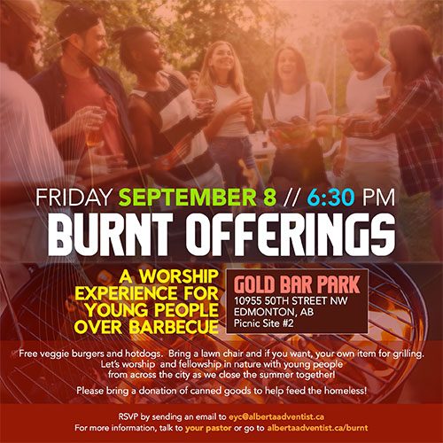 On Friday, September 8, at 6:30 pm, come on out to Burnt Offerings: a worship experience over barbecue for young people! Featuring free veggie burgers and hotdogs. Bring a lawn chair and, if you want, your own item for grilling. Let's worship and fellowship in nature with young people from across the city as we close the summer together and start the school year. Please bring a donation of canned goods to help feed the homeless!