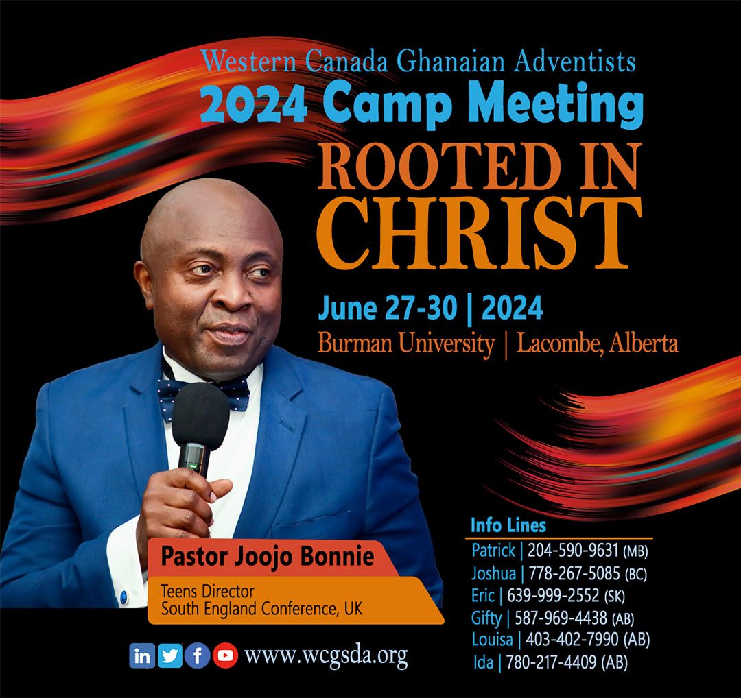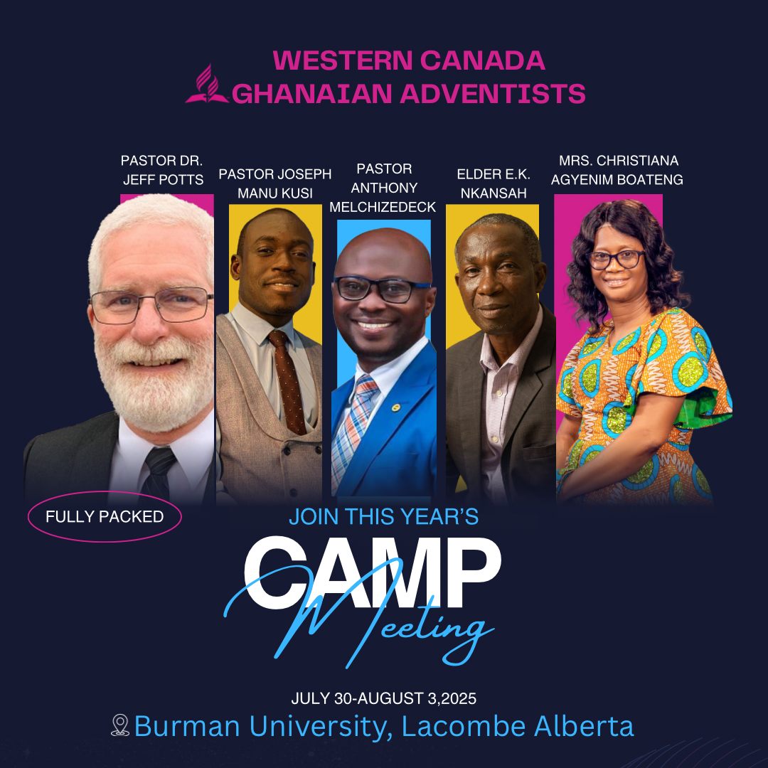 The 9th Annual Western Canada Ghanaian Adventists (WCGSDA) Camp Meeting takes place at the Burman University Campus, Lacombe, from July 30-August 3rd, 2025. This year’s gathering is set to be unforgettable, a sacred appointment with God under the theme “The Coming of the Lord is at Hand”. Read about our featured speakers, including our powerful main speaker whose words will stir hearts and awaken purpose. But that’s not all - we’ll be unveiling additional anointed speakers soon, and trust us, you won’t want to miss what God has in store through these vessels of truth. Register early to reserve your accommodation, especially if you want to claim one of the coveted LakeView spots, where you’ll wake each morning with a view that reminds you of heaven’s peace and the Creator’s grandeur. This year, we are expecting a record number of participants, so don’t wait too long! Come and be fed - spiritually, physically and mentally. Come and rest - not just your body, but your soul and your mind. Come and encounter God - in worship, in fellowship, and in the Word. Let Camp Meeting 2025 be your spiritual mountaintop, your divine retreat, your refueling station for the journey ahead. — Benjy Acquah
