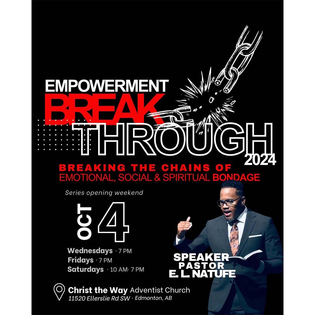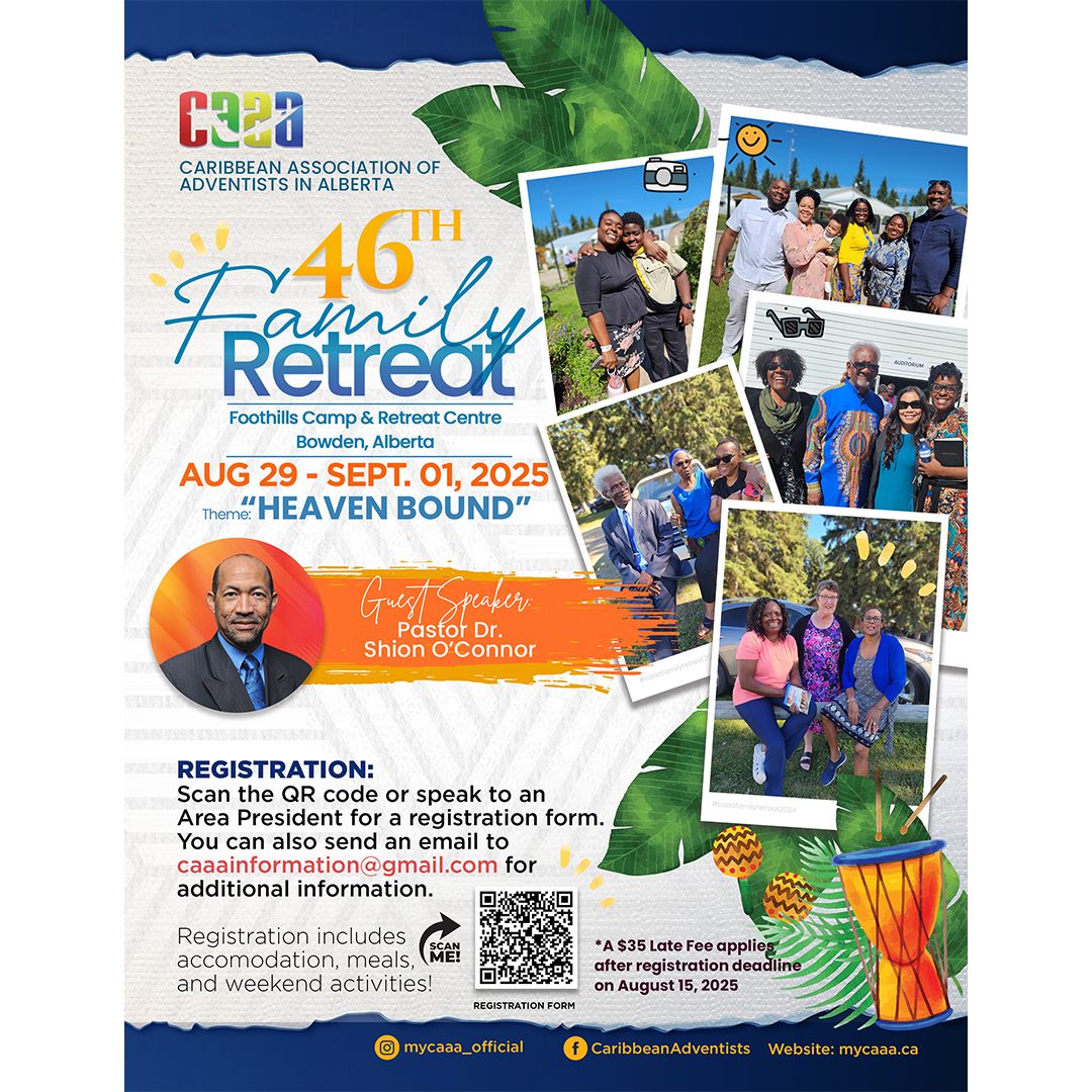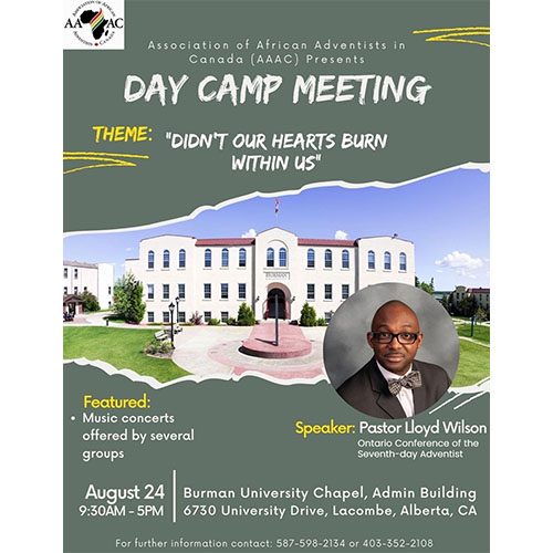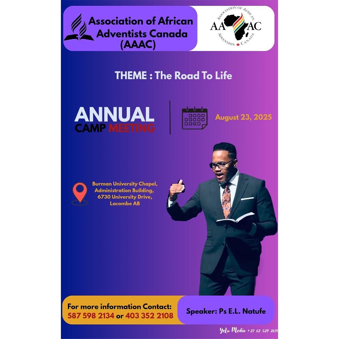 The Association of African Adventists in Canada invites you to their annual camp meeting on August 23, 2025 at Burman University. The theme of the camp meeting is “The Road To Life.” You will be blessed with the messages of dynamic speaker Pastor EL Natufe and the soulful harmonies of various music groups from around Alberta. All are welcome!