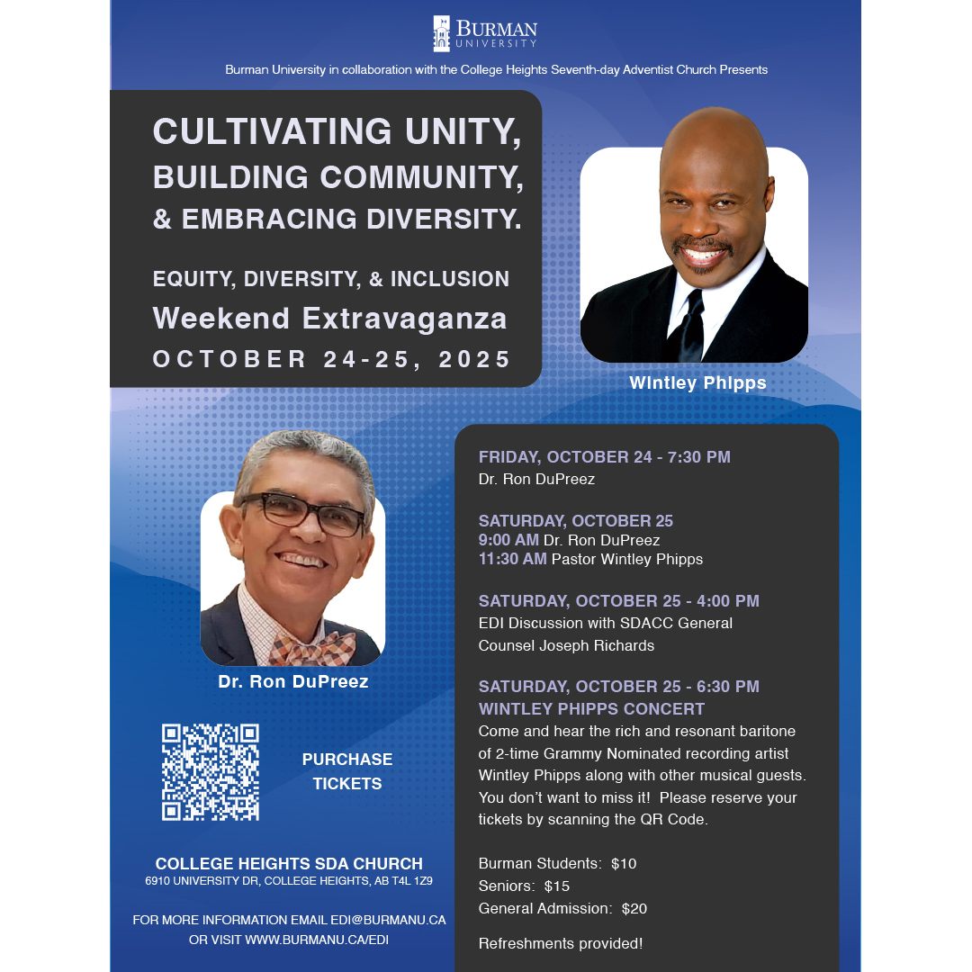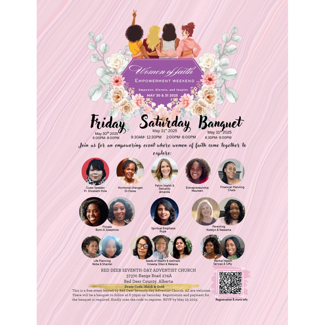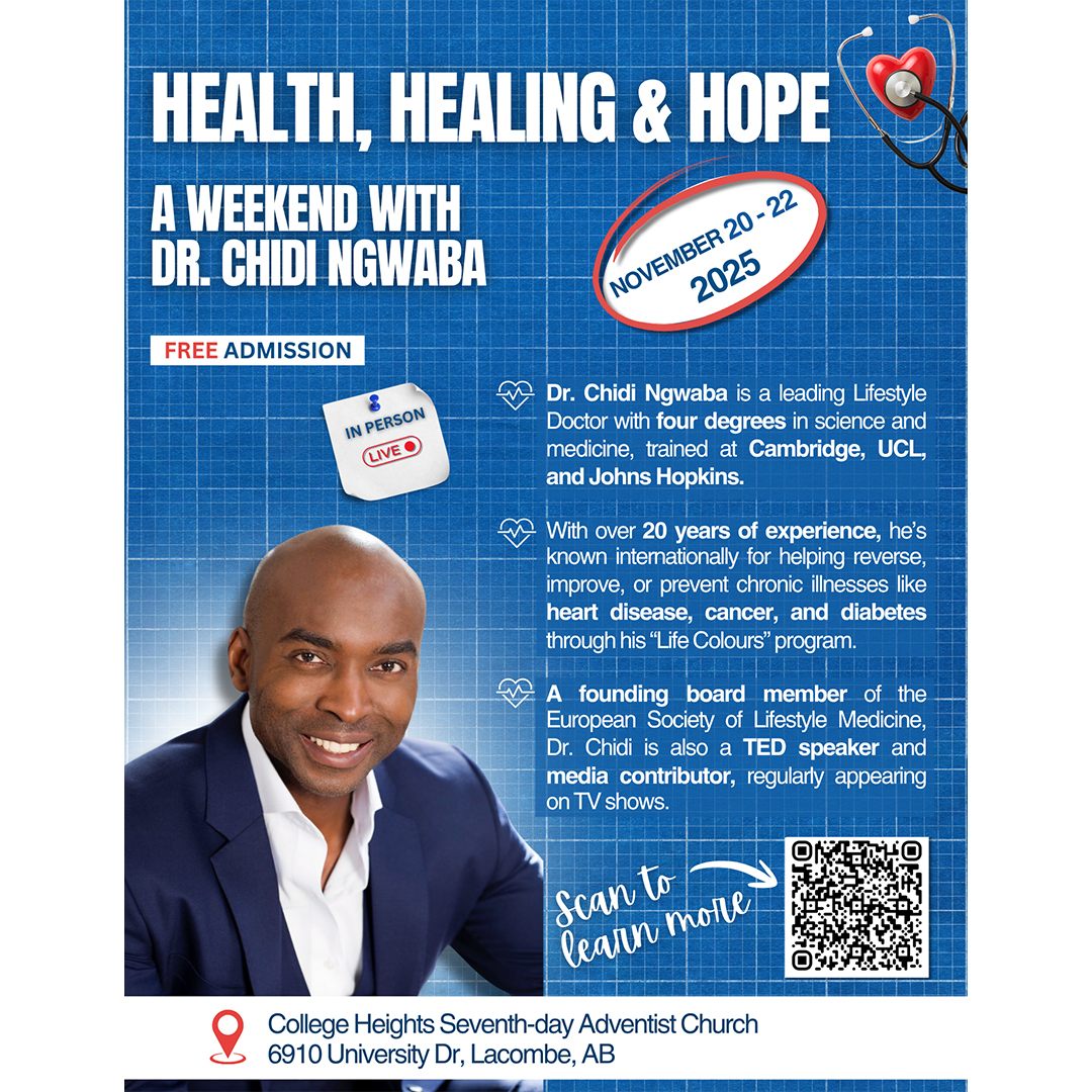The Association of African Adventists in Canada invites you to their annual camp meeting on August 23, 2025 at Burman University. The theme of the camp meeting is “The Road To Life.” You will be blessed with the messages of dynamic speaker Pastor EL Natufe and the soulful harmonies of various music groups from around Alberta. All are welcome!