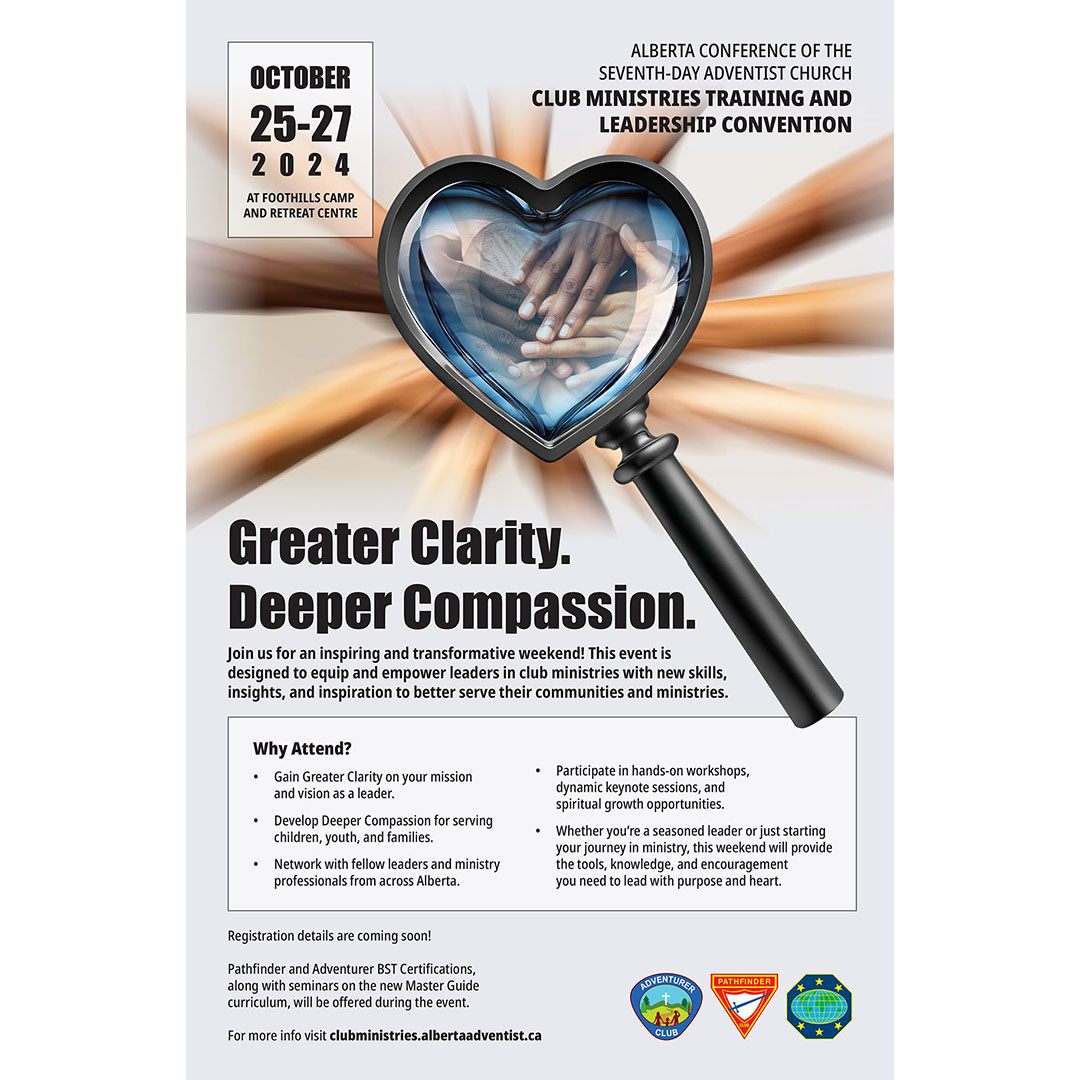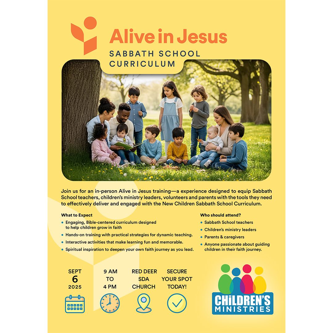 Are you passionate about reaching children for Jesus? Looking for innovative ways to make Sabbath School class the best it can be? Join the Children's Ministry Directors from the North American Division as they instruct and empower attendees to impact children for eternity. Sponsored by GEMA & hosted at Edmonton South Adventist Church. $20 per person, with Sabbath lunch and supper provided. Register at https://forms.office.com/r/EuVPrGc0nc or email GEMAinfo@albertaadventist.ca for more info.