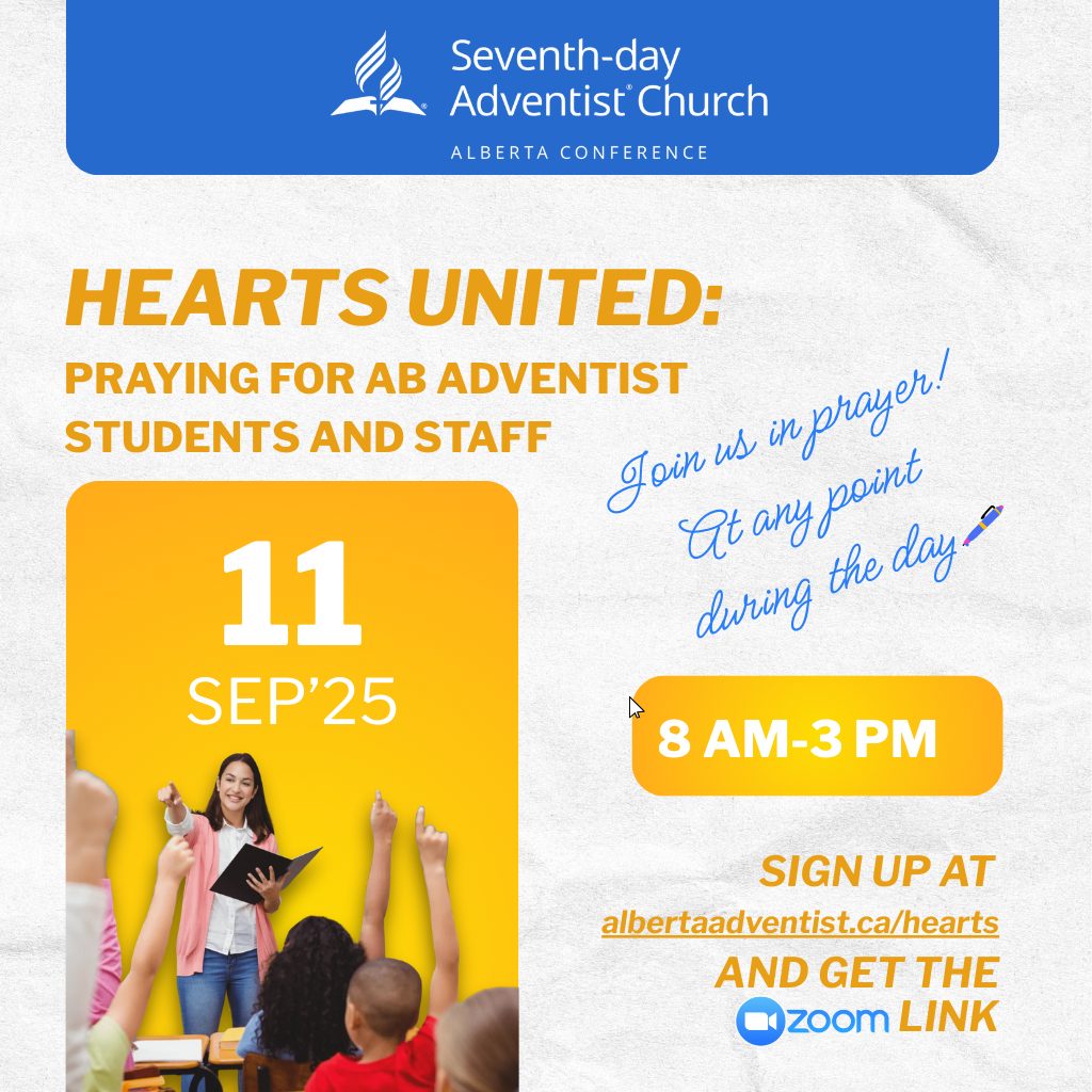 As September begins, we know that the path to success for our students and staff begins with our God first and foremost. Come take part in Hearts United: A Day of Prayer for Alberta Adventist Education, you are invited to join with others across the Conference and ask God for His blessing for the year. Each school will lead out in a 30 minute session during the day. Come out to be blessed and be a blessing! For more information, contact us at prayerministries@albertaadventist.ca