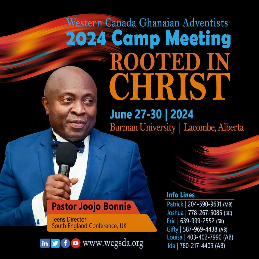 8th Annual Camp Meeting of Western Canada Ghanaian Seventh-day Adventists (WCGSDA) Get ready to be inspired and uplifted as we gather at Burman University Campus from June 27-30th, 2024, for a spiritual journey like no other. Our theme "ROOTED IN CHRIST", sets the stage for a transformative experience, where participants will delve deep into our faith and strengthen our connection with the Savior. Don't miss the opportunity to hear from our esteemed guest speaker, Pastor Joojo Bonnie, who is currently the Teens Director, South England Conference of the Seventh-day Adventist Church, United Kingdom. He will guide us through powerful messages and insights rooted in the teachings of Christ. Come, be part of a community rooted in faith, fellowship, and love. Let's grow together in our spiritual journey at this year’s WCGSDA Camp Meeting. This is an opportunity to meet, connect and fellowship with friends, family and loved ones from Alberta, Manitoba, Saskatchewan, British Columbia and the Northwest Territories. Early bird registration for the camp meeting ends May 31st, 2024. Register Now at https://wcgsda.org/2024-camp-meeting/