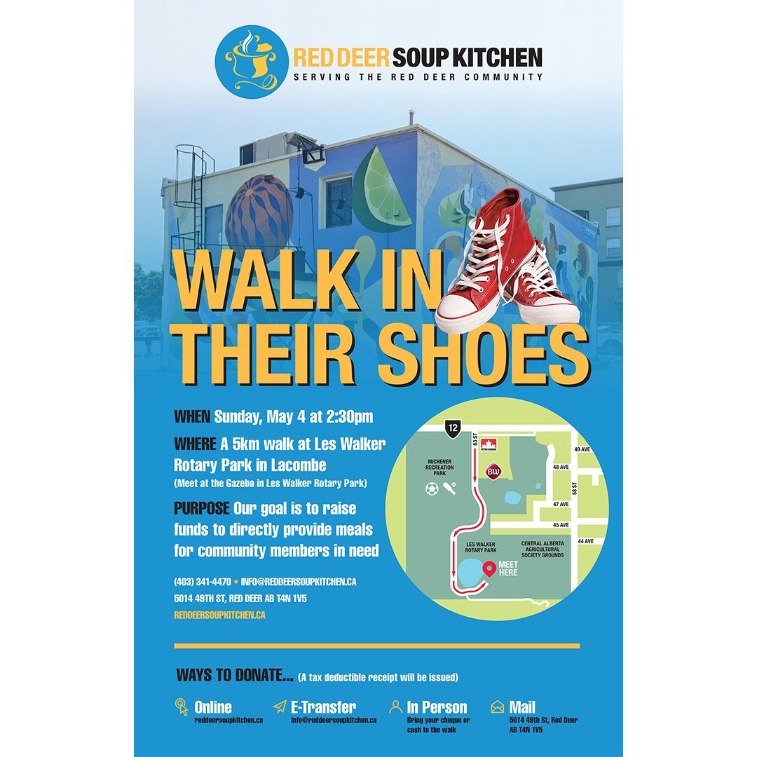 Ready, Set, Walk! Get ready to have some fun participating in the Red Deer Soup Kitchen’s 3rd annual “Walk in their Shoes” fundraiser event at Les Walker Rotary Park in Lacombe.