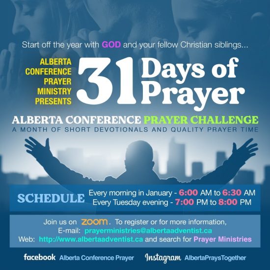 Start off the year with God and your fellow Christian siblings with 31 Days of Prayer from January 1 to 31! From across the Alberta Conference, you are invited to come together for short devotionals and prayer every morning over Zoom from 6 AM to 6:30 AM and every Tuesday evening from 7 PM to 8 PM to kickstart 2022 in a powerful and prayerful way. Looking forward to praying with you! Please register to get the link. Register and get more information by sending an email to prayerministries@albertaadventist.ca