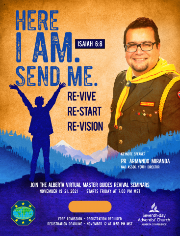The Alberta Conference Uniform Ministries is excited to host the 2021 Master Guide Revival Seminar "Here I am. Send me" led by Pastor Armando Miranda, NAD Assoc. Youth Director.