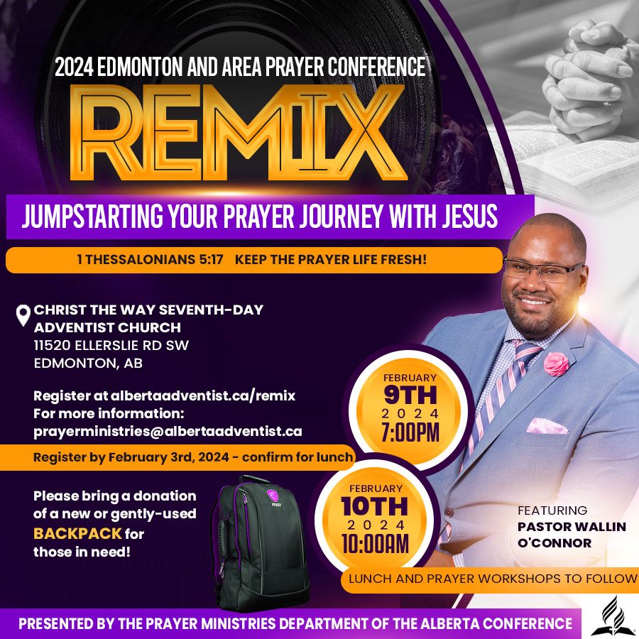Put a spark in your relationship with God through prayer with Remix: Jumpstart your Prayer Journey with God, the 2024 Edmonton Area Prayer Conference. Featuring dynamic speaker Pastor Wallin O'Connor. February 9 @ 7 pm and February 10 @ 10 am at Christ The Way Seventh-day Adventist Church, 11520 Ellerslie Road SW in Edmonton. Morning program followed by lunch and prayer workshops. Please bring a donation of a new or gently-used backpack for those in need. Register by February 3; confirm if you want lunch. Register at albertaadventist.ca/remix
