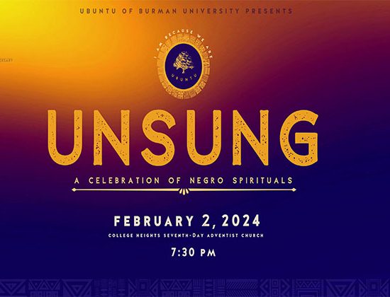 Burman University is thrilled to announce that UBUNTU’s annual concert, Unsung, at College Heights Adventist Church. This year, we celebrate 5 years of music making, community building, and the pursuit of excellence. The concert is free, but we encourage you to bring a donation for Ubuntu’s Spring Tour to The Bahamas. Please consider donating to Ubuntu’s ministry.