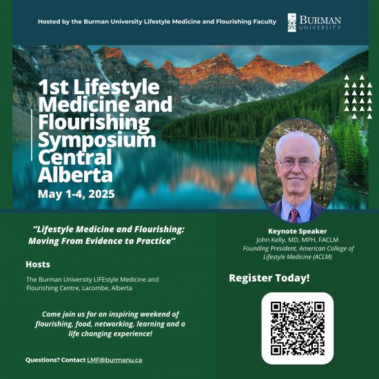 Medical professionals and others interested are invited to participate in, Lifestyle Medicine and Flourishing: Moving From Evidence to Practice, a professional symposium hosted at Burman University. Keynote Speaker is John Kelly, MD, MPH, FACLM, the founding president of the American College of Lifestyle Medicine. He will be joined by 10 other lifestyle medicine physicians and psychologists. Don’t miss this incredible opportunity to engage in the latest insights of evidence-based lifestyle medicine and to network with fellow professionals. Register by April 1 to save $100 off the registration fee. See the poster for lecture details, schedule, and pricing, or contact LMF@burmanu.ca for questions.