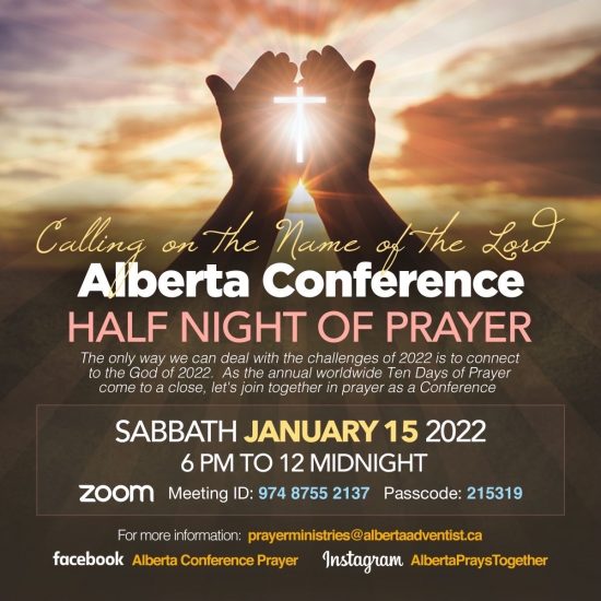 The Alberta Conference Prayer Ministries invites you to a Half Night of Prayer on Saturday night January 15, 2022, from 6 PM to midnight over Zoom. The only way to deal with challenges of 2022 is to connect with the God of 2022. Meeting ID: 916 5275 0172 Passcode: 857754