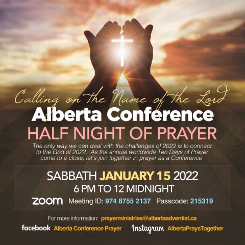The Alberta Conference Prayer Ministries invites you to a Half Night of Prayer on Saturday night January 15, 2022, from 6 PM to midnight over Zoom. The only way to deal with challenges of 2022 is to connect with the God of 2022.