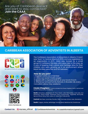 Are you of Caribbean descent and want to stay connected? Join the CAAA! The Caribbean Association of Adventists in Alberta is a non-profit organization fostering cultural and Spiritual enrichment for Caribbean-Canadians of the Seventh-day Adventist church.