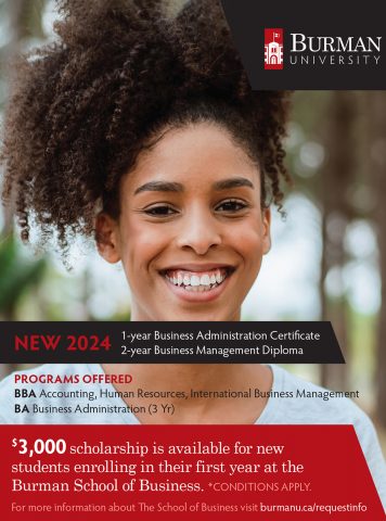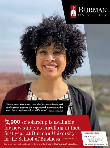 Burman University is offering a new School of Business Scholarship in the amount of a $3,000 one-time non-renewable award. This scholarship is for students beginning their first year at Burman University in the School of Business.