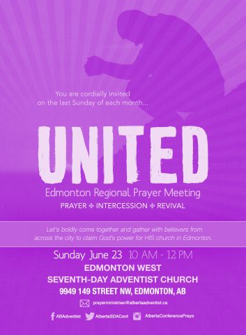 Edmonton members are invited to UNITED on Sunday June 23 from 10 am to 12 pm at Edmonton West Church. Come out to pray for our churches, our city, our communities, our outreach, our triumphs, and our trials! For more information or to ask any questions, please contact your church Prayer Coordinator or send an email to prayerministries@albertaadventist.ca.