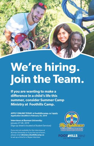 For more information and to apply online, please visit: www.foothillscamp.ca/apply. Interviews will be held at Burman University, January 27 & 28, 2019. If you are not available for the interviews at Burman or if you live out of town, please email director@foothillscamp.ca to set up a time for a Skype interview.