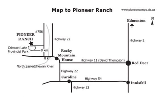 - Go past the Crimson Lake Provincial Park entrance 1 km and turn left at the Pioneer Ranch Camp sign. Follow the gravel road into the camp
